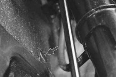4. Выверните один болт крепления брызговика двигателя к защитному брусу, два болта крепления к поперечине на кузове...