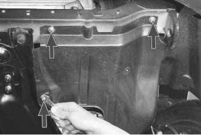 Снимают брызговик двигателя при его повреждении или для обеспечения доступа к узлам и агрегатам снизу автомобиля при проведении ремонта и технического обслуживания.
