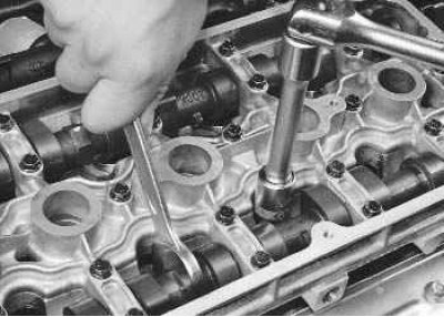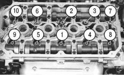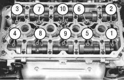 Примечание. Для доступа к некоторым болтам крепления головки блока цилиндров необходимо провернуть распределительные валы.