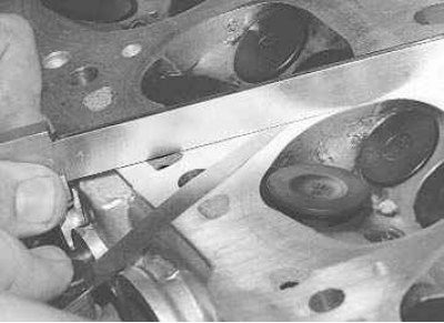 18. Проверьте плоскостность поверхности головки блока, прилегающей к блоку цилиндров. Для этого поставьте линейку ребром на поверхность головки сначала посередине вдоль, потом по диагонали, затем щупом измерьте зазор между плоскостью головки и линейкой. Замените головку, если зазор превысит 0,1 мм.