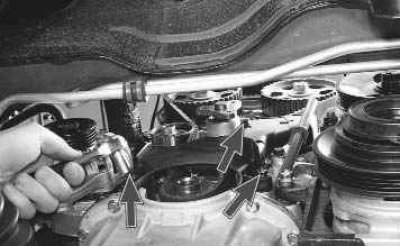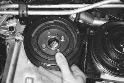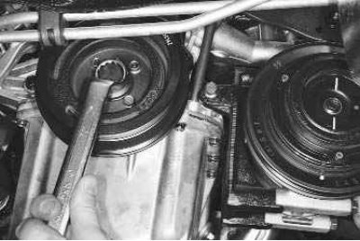 10. Зафиксировав коленчатый вал двигателя от проворачивания, выверните болт шкива привода дополнительных агрегатов...