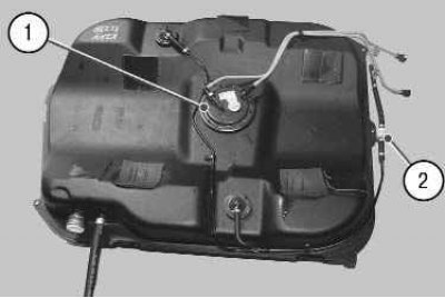 Наливная труба соединена с баком бензостойким шлангом, закрепленным на патрубках хомутами. В пробке наливной трубы расположен воздушный впускной клапан. Для того чтобы пары топлива не попадали в атмосферу, бак соединен трубопроводом с адсорбером. Для предотвращения нагрева от системы выпуска отработавших газов двигателя на бак установлен термоэкран. В отверстии в верхней части бака установлен топливный модуль 1. К боковой части топливного бака крепится двухходовой клапан 2 системы улавливания паров топлива.