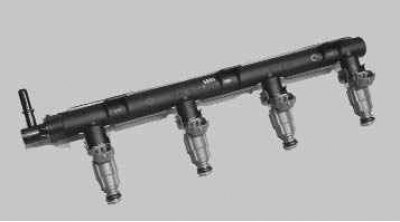 Топливная рампа представляет собой литую пустотелую деталь с отверстиями для установки форсунок и подводящего штуцера для присоединения топливопровода высокого давления. Форсунки уплотнены в гнездах резиновыми кольцами и закреплены пружинными фиксаторами. Форсунки в сборе с рампой вставлены в отверстия ресивера и закреплены двумя болтами.