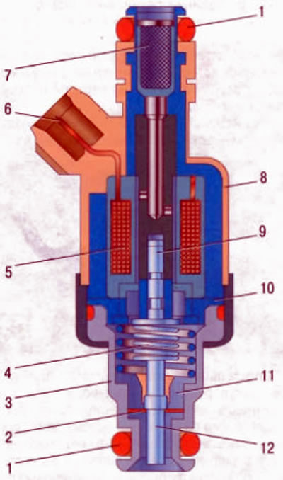 Рис. 5.12. Форсунка системы впрыска топлива: 1 – уплотнительное кольцо; 2 – пластина распылителя; 3 – корпус распылителя; 4 – пружина; 5 – обмотка электромагнита; 6 – штекерный вывод обмотки электромагнита; 7 – топливный фильтр; 8 – корпус электромагнита; 9 – сердечник; 10 – дистанционная втулка; 11 – седло клапана; 12 – игла запорного клапана