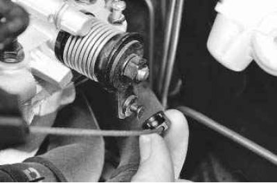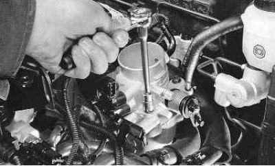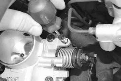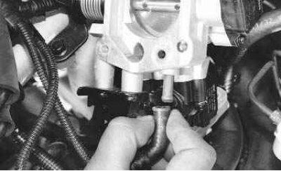 Отсоедините от кронштейна дроссельного узла трос его привода (см. «Замена троса привода дроссельной заслонки»).