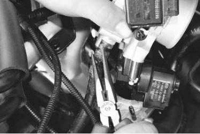 12. Сожмите усики хомута крепления шланга подвода охлаждающей жидкости к дроссельному узлу, сдвиньте хомут по шлангу...