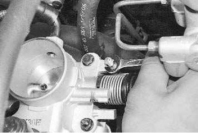 10. Выверните два болта, отверните две гайки крепления дроссельного узла к впускной трубе...