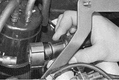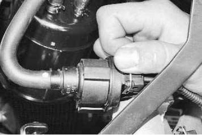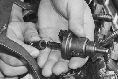5. Ослабьте хомуты крепления шланга адсорбера к штуцеру электромагнитного клапана, сжав пассатижами их отогнутые усики; сдвиньте хомуты по шлангу...
