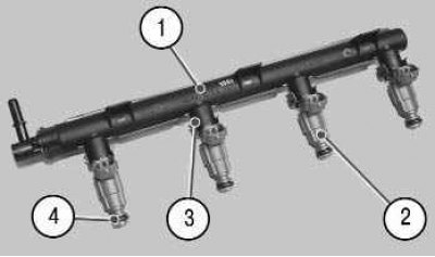 Примечание. Так выглядят детали топливной рампы: 1 – топливная рампа; 2 – форсунка; 3 – стопорная пластина форсунки; 4 – уплотнительное кольцо.