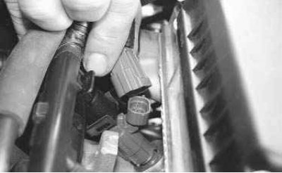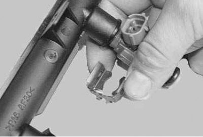7. Сожмите два фиксатора крепления наконечника топливопровода к штуцеру топливной рампы...