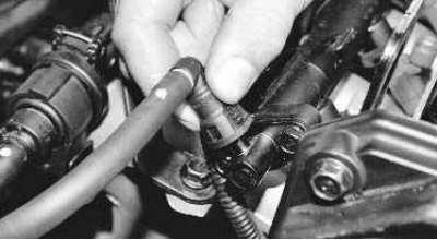 Примечание. Проверку форсунки по форме распыляемого факела топлива и на герметичность проводите на специализированных станциях технического обслуживания, так как эта проверка, выполненная непосредственно на автомобиле, очень пожароопасна.