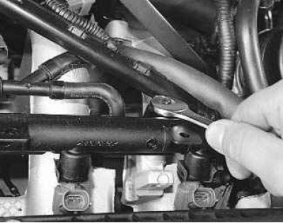 Примечание. Один из болтов крепления топливной рампы к ресиверу одновременно является и креплением кронштейна колодки жгута проводов.
