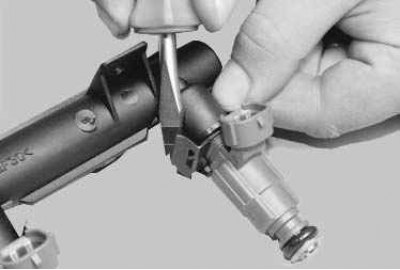 Внимание! Если при снятии топливной рампы какая-либо из форсунок останется в ресивере, обязательно замените стопорную пластину этой форсунки.