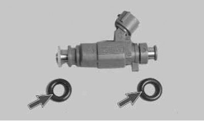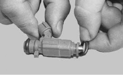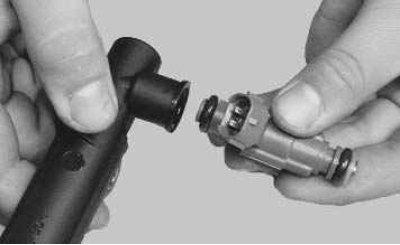 14. Снимите уплотнительные резиновые кольца форсунки со стороны распылителя и со стороны топливной рампы.